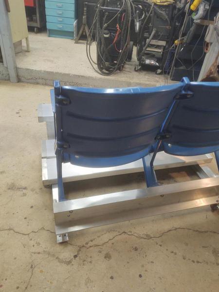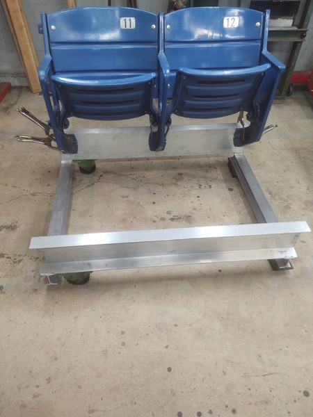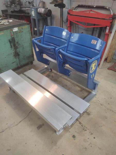 This portable bleacher incorporates a couple of seats from the old Veterans stadium in Philadelphia.